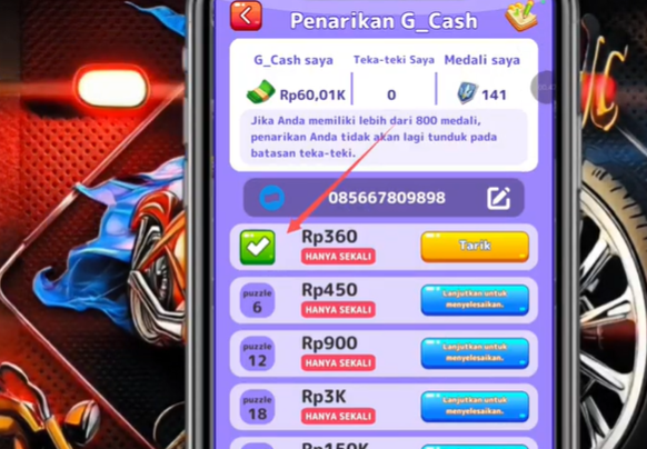 Jika Puzzle sudah cukup, langkah selanjutnya adalah membuka menu penarikan pada aplikasi. Pilih jumlah nominal yang tersedia sesuai Puzzle yang telah terkumpul. Untuk penarikan pertama, tidak ada syarat Puzzle sehingga bisa langsung diproses. Namun untuk penarikan selanjutnya, sistem akan memeriksa apakah Puzzle sudah sesuai.